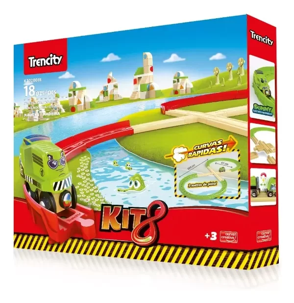 Está compuesto por 18 piezas: 1 locomotora con enganche magnético, 1 cruce a nivel, 4 rectas grandes y 12 curvas grandes con pared antivuelco. La pista tiene un recorrido dinámico de 3 metros de largo.