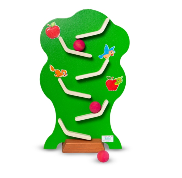 Producto realizado en mdf, álamo, palo blanco y pino. Todas maderas de reforestación. El juego trae tres bolas, seis rampas y una base.