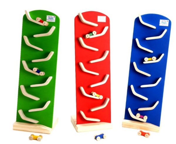 Es producto realizado en mdf, álamo y palo blanco. El juego trae 3 autos con ejes de alta seguridad y una base. Recomendado para niños a partir de un año de edad.