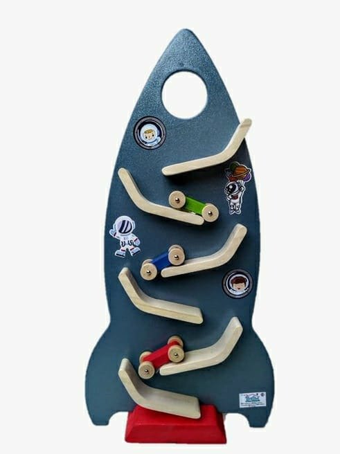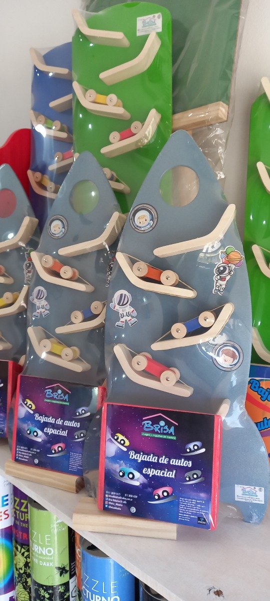 Producto realizado en mdf, álamo, palo blanco y pino. Todas maderas de reforestación. El juego trae tres autos, seis rampas y una base.