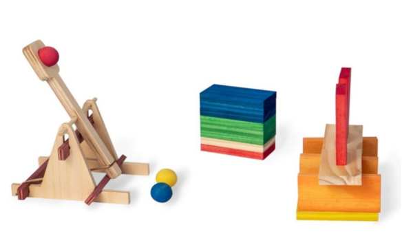 Arma la catapulta y con las fichas realiza una construcción para luego derribarla lanzando las bolitas de madera.