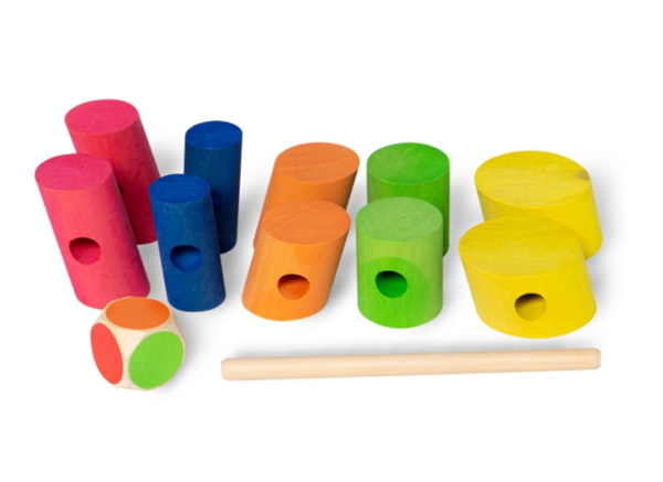 El juego contiene 10 troncos, 1 dado y una varilla. Realizado en madera de guatambu y palo blanco.