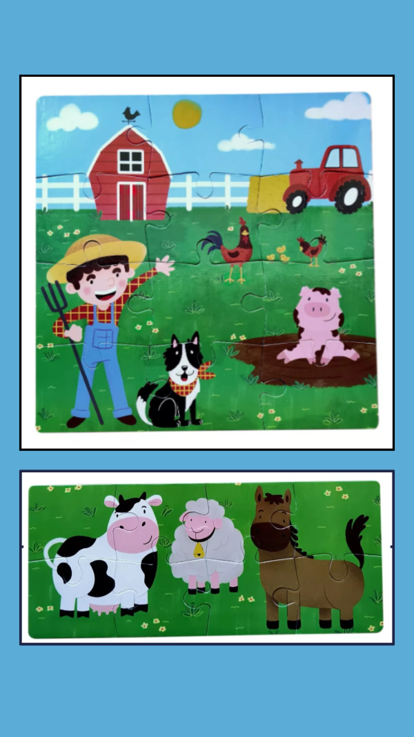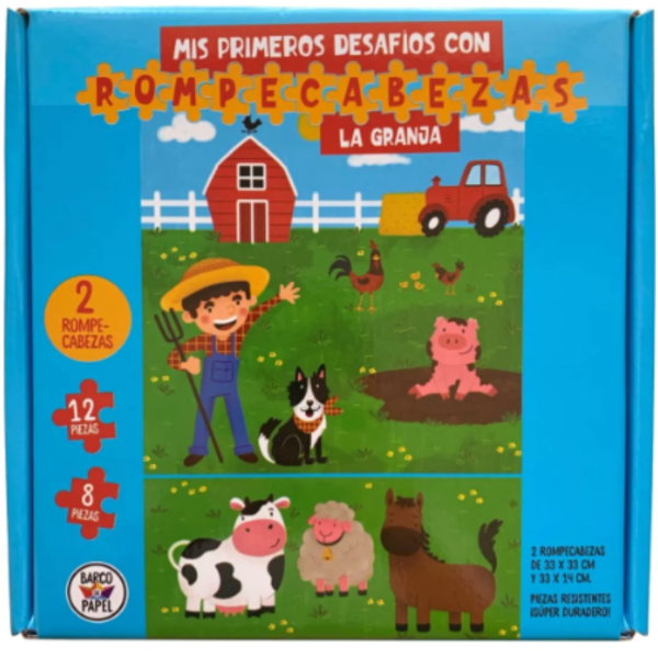 Dos rompecabezas de 8 y 12 piezas con animales de la granja, con piezas grandes super resistentes. Ideal para que los mas pequeños puedan comenzar a armar los primeros rompecabezas.